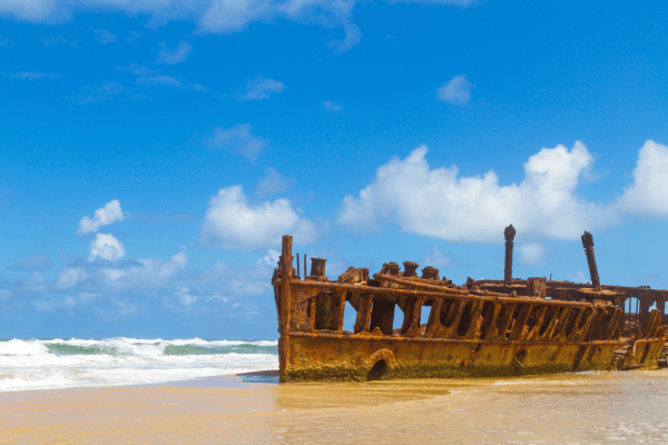 The SS Maheno, built in 1905, was one of the first turbine-driven steamers. After being retired, it was en route to Japan for scrap when a storm caused it to be washed ashore on 75 Mile Beach on K’gari.